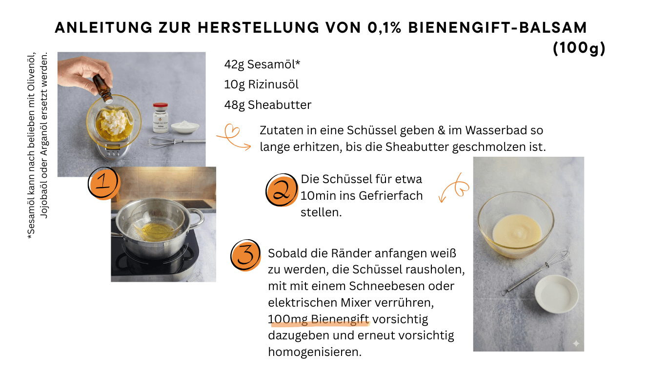 Bitte verwende Deine Bienengift-Lösung sehr vorsichtig & in minimalen Mengen, denn jeder Körper ist unterschiedlich empfindlich. Sicherlich wirst Du nach einigen Anwendungen wissen, wieviel Deinem Körper gut tut.